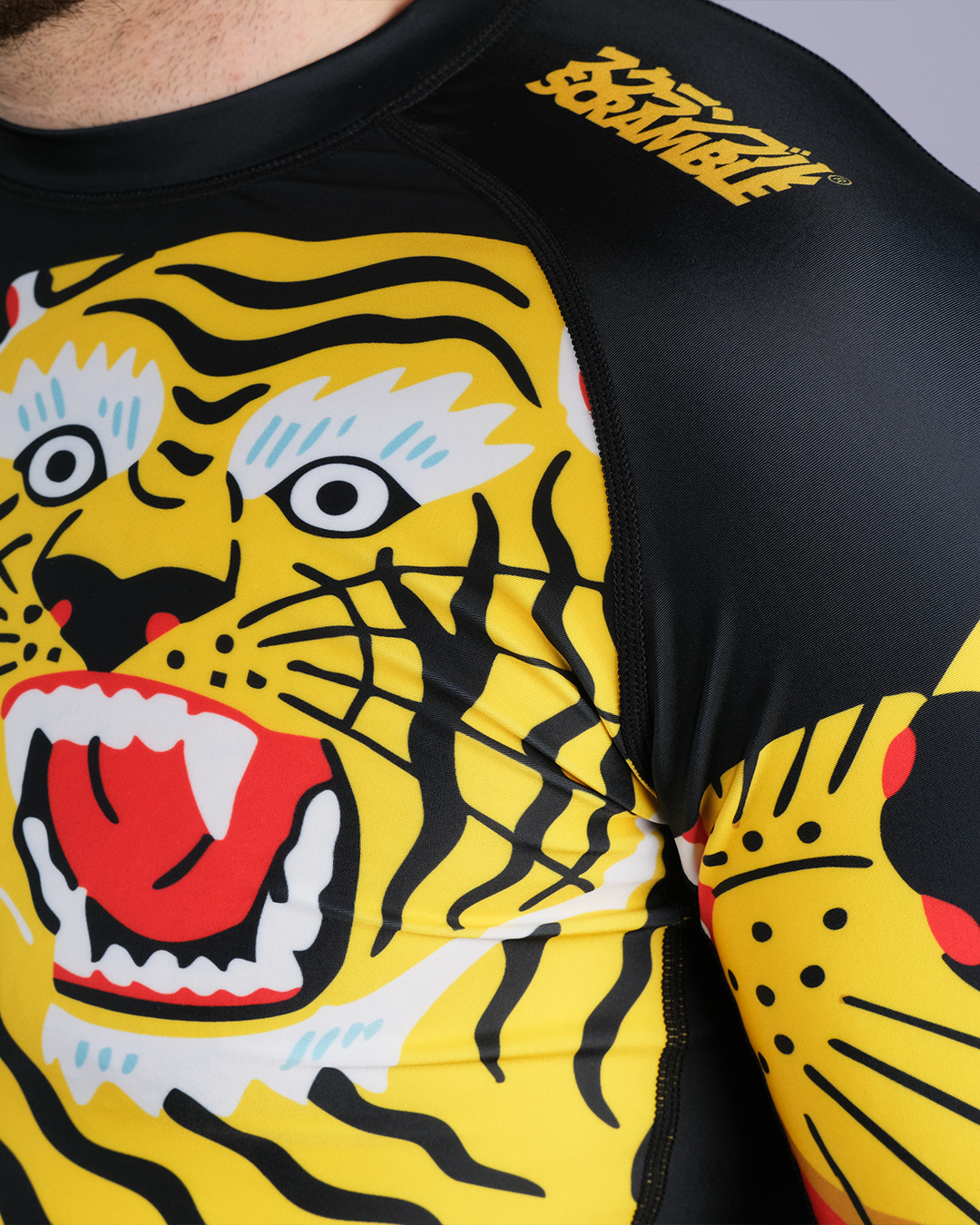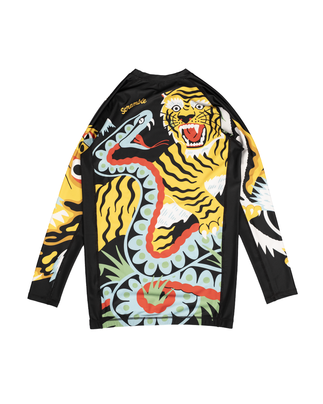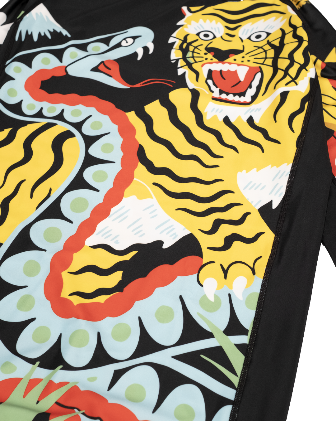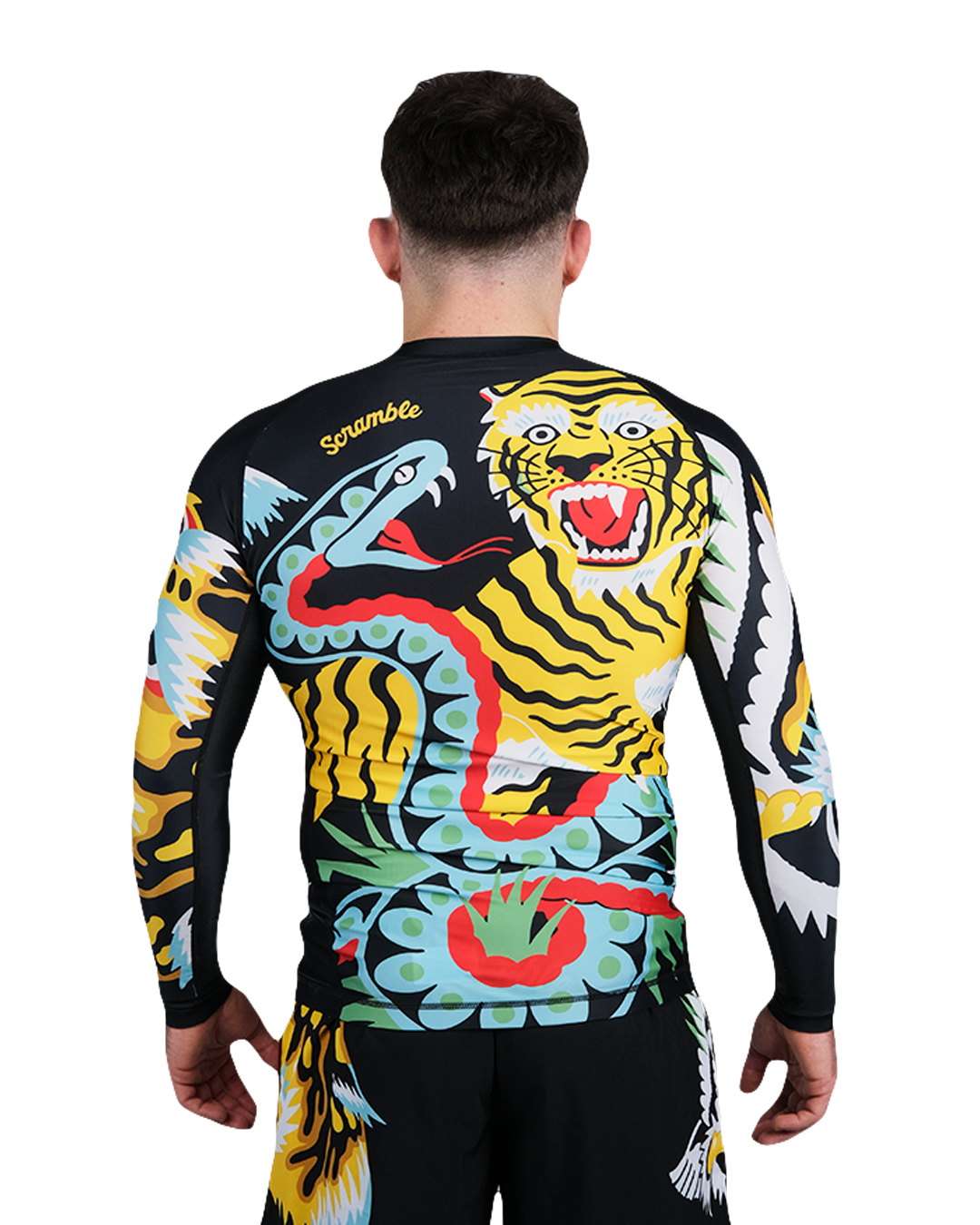 This bright, bold and colourful nogi grappling set features artwork from the talented Kieran Hoohar, a tattoo artist and jiujitsu enthusiast in London. The artwork is made up of firm favourites from tattoo illustrations in tiger and snake, jaguar, and eagle images, all done in Kieran’s signature style. The rashguards come in both long sleeved and short sleeved versions (long sleeved is a timed exclusive for the USA) and we also have grappling shorts and long spats (the grappling spats are a timed exclusive for the USA.)